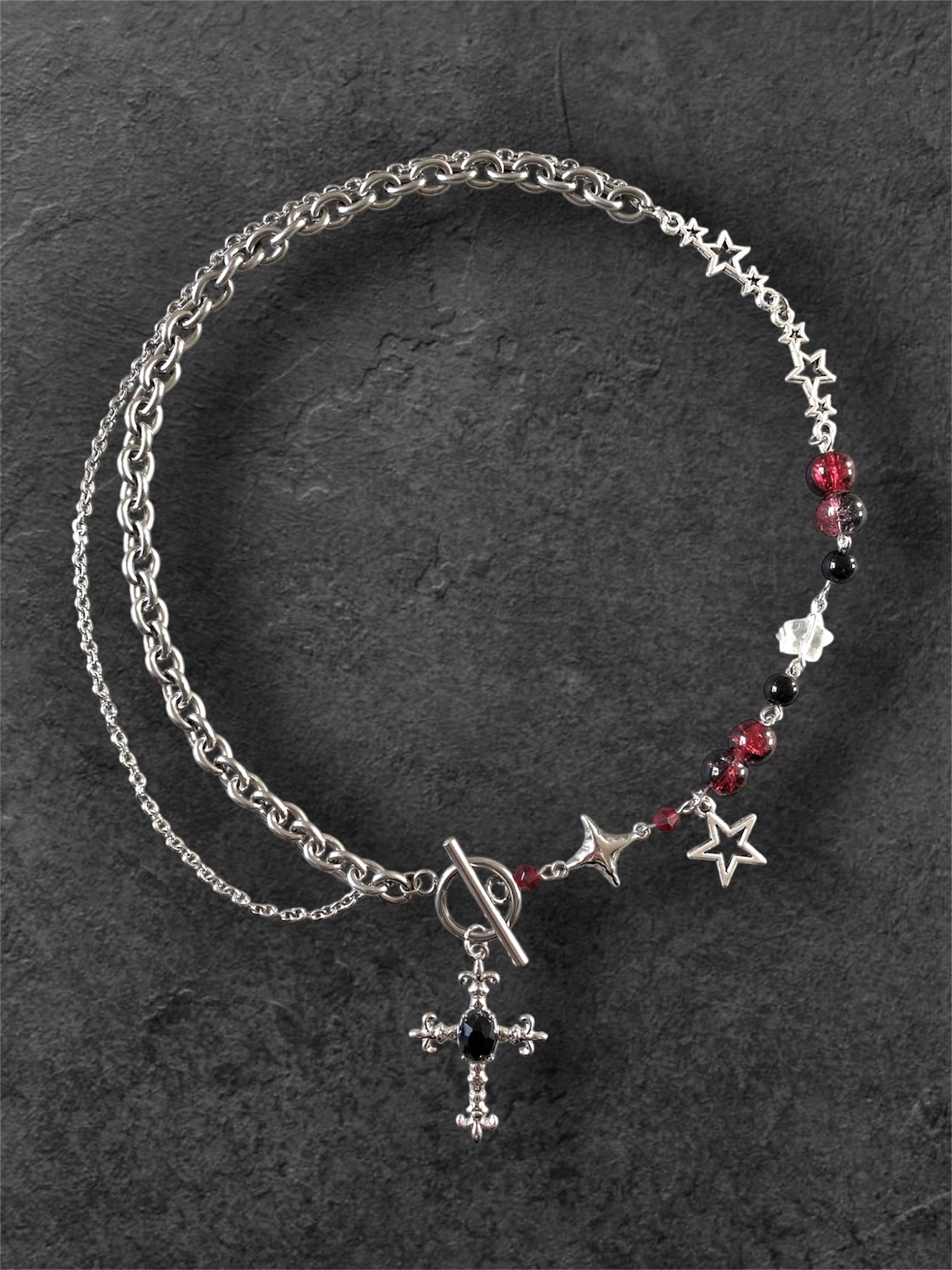 This striking Glitch Cross necklace features a chunky silver-toned chain with a toggle clasp and a gothic cross pendant. The chain is uniquely accented with dark red and black beads, as well as a mix of stars, giving it a cool, celestial aura.