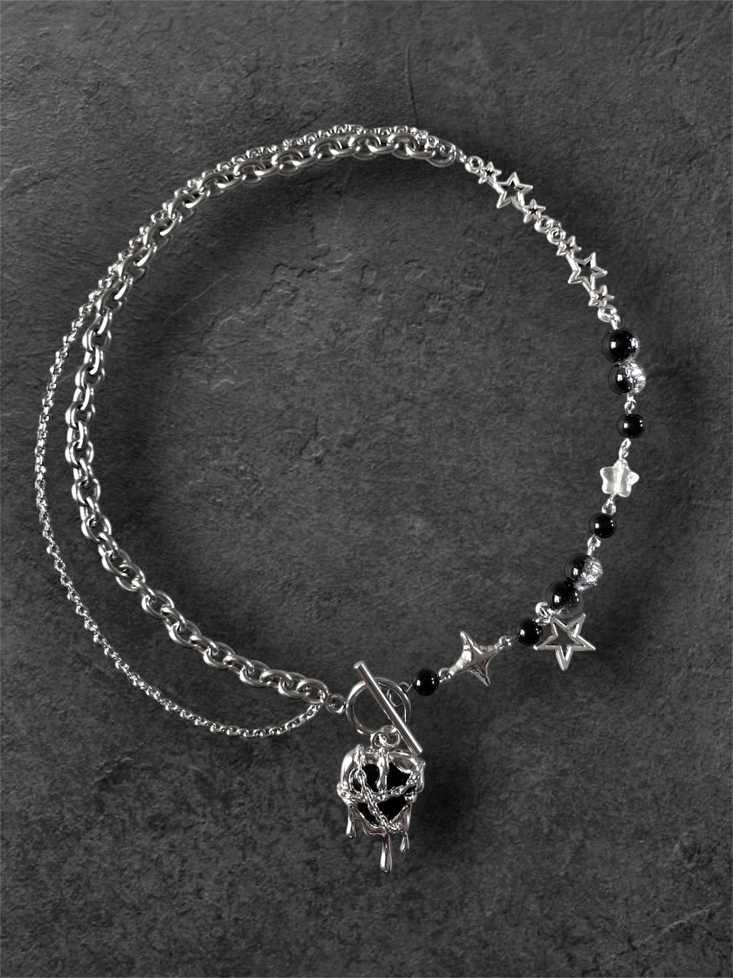 This unique Glitch Heart necklace features a chunky silver-toned chain with a toggle clasp, anchored by a dramatic, dripping black heart pendant. The design is further enhanced with a mix of black and iridescent beads and celestial star charms, creating a look that's both whimsical and enchanting.