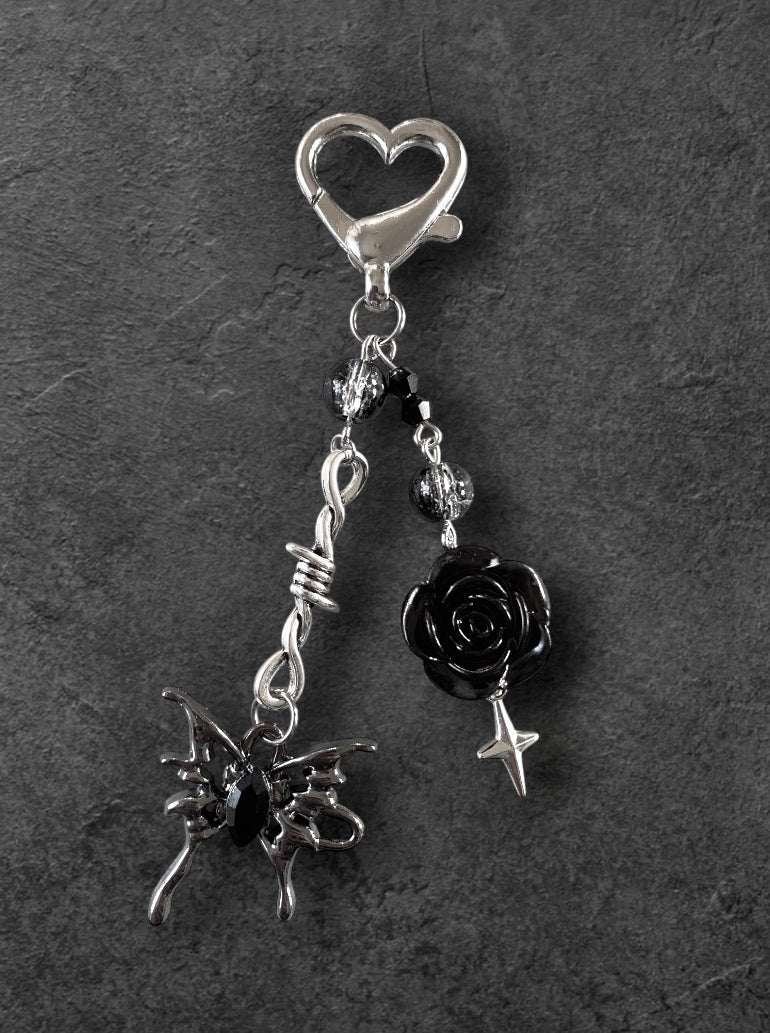 Embrace a sense of dark romance with this captivating Magical Moth keychain. A beautifully crafted black rose and a detailed moth charm with a black gem are suspended from a heart-shaped clasp, alongside mystical black beads and a spiky star.