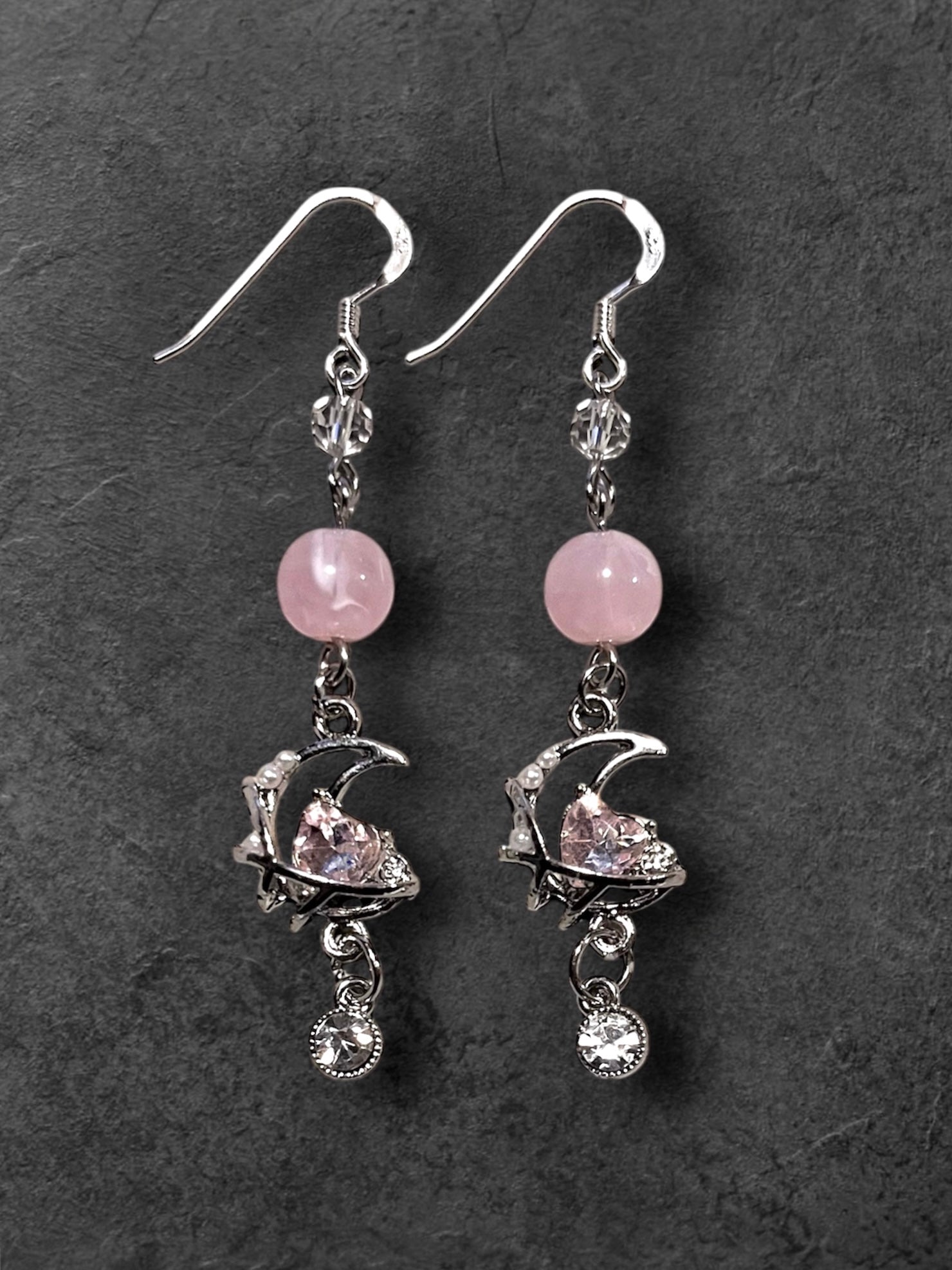 The Blush Moon earrings feature a blush pink bead that sits below a twinkling clear bead and above a delicate moon charm that holds a shimmering pink heart. A cute and whimsical accessory!