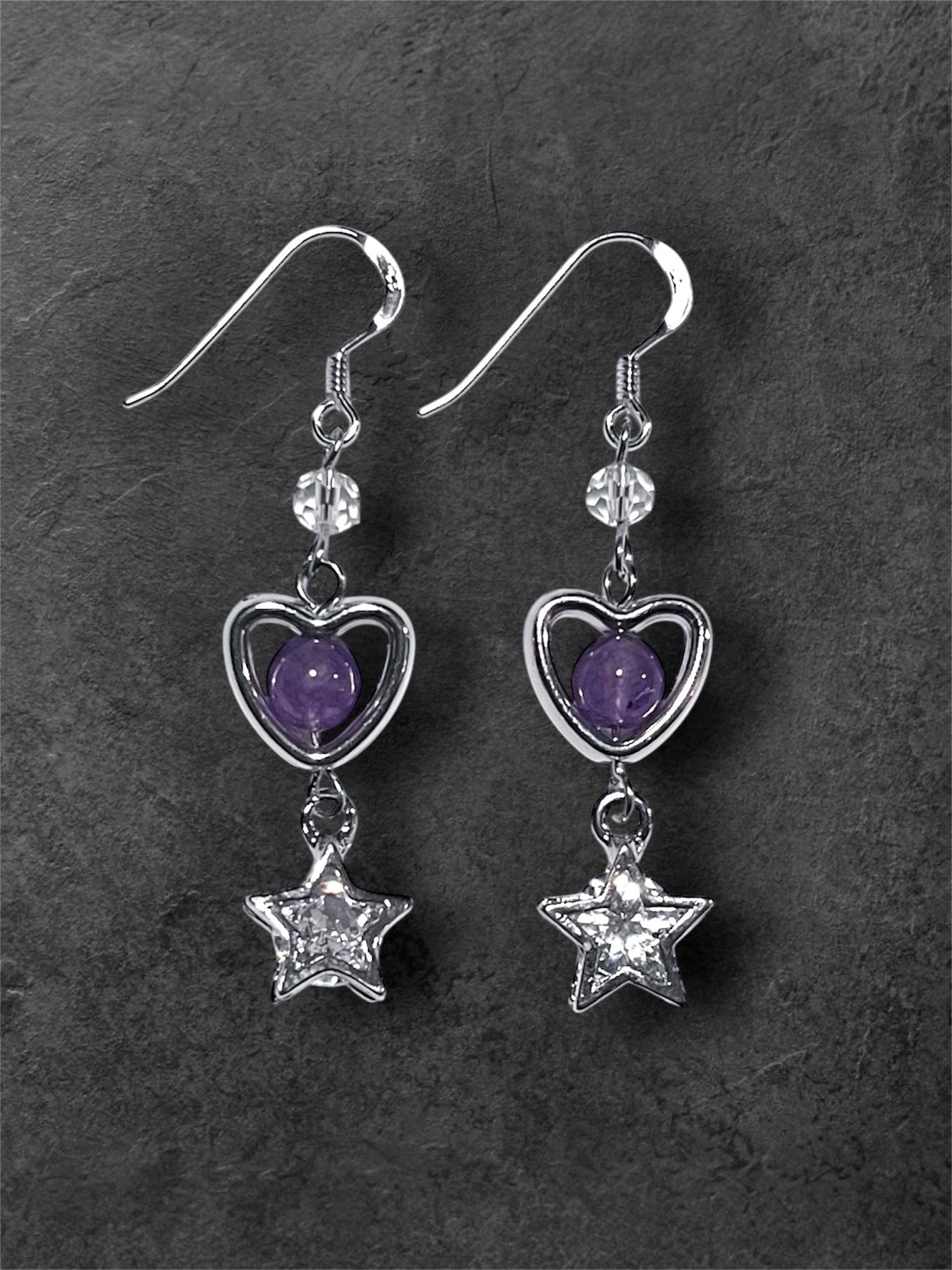 The Lilac Star earrings feature a mystical purple coloured bead cradled in a heart and a shining faceted star at the base.