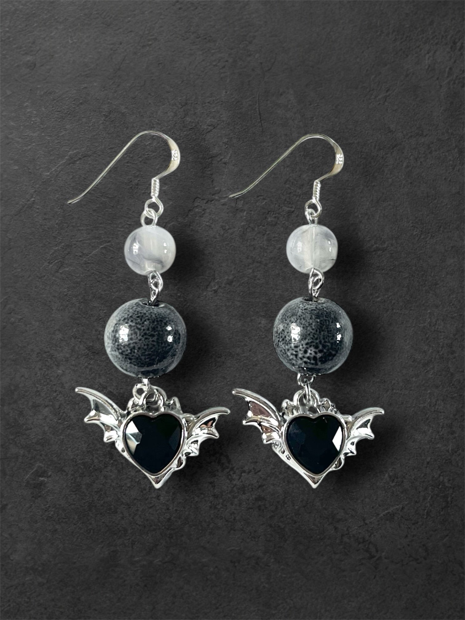 The Shadow Bat earrings feature a bold two-tone stone drop—a smooth, lighter bead atop a darker, textured bead—leading down to a captivating bat-winged heart charm.