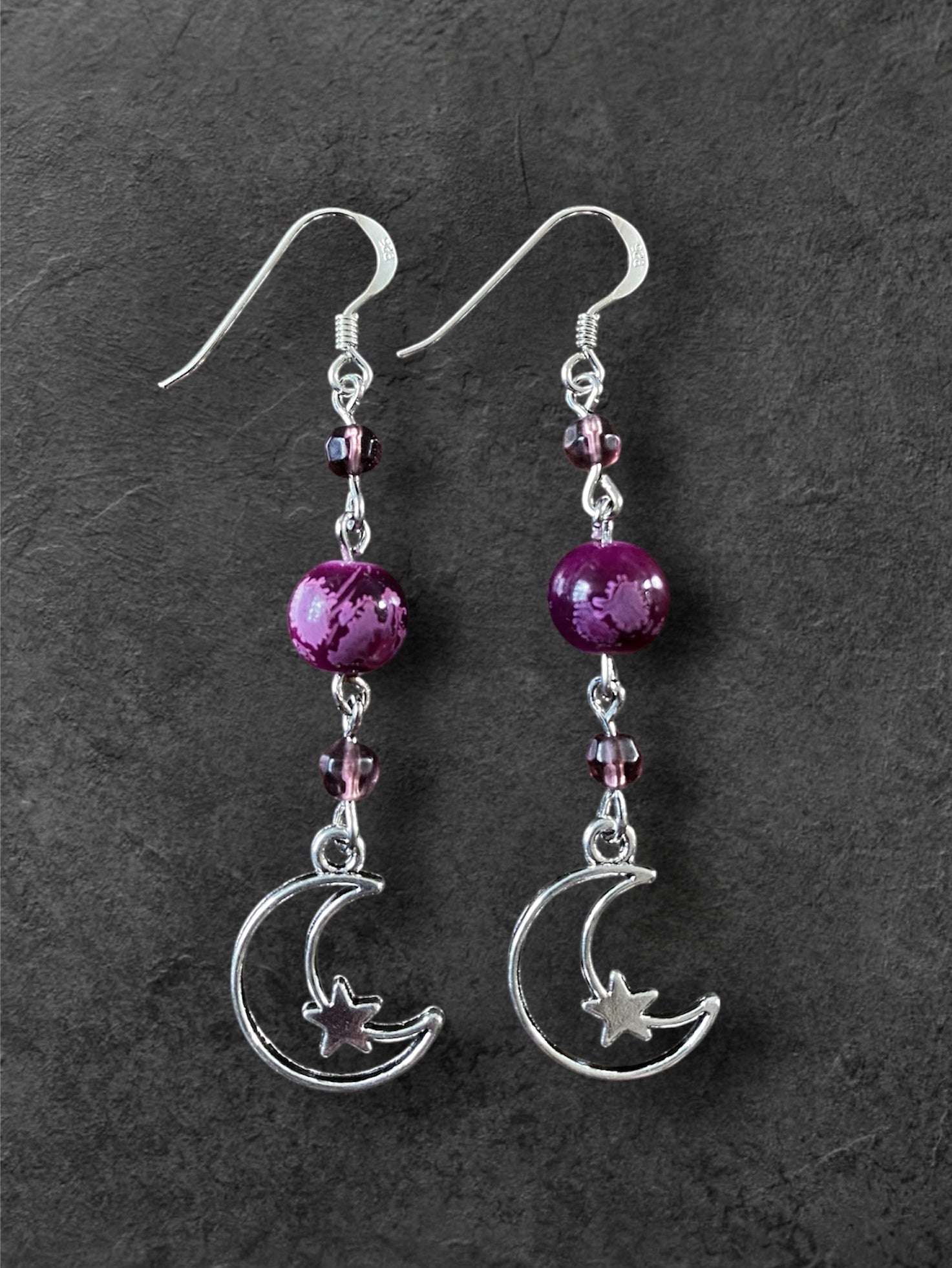 These Violet Skies earrings feature dangling silver moons with tiny stars, paired with vibrant purple beads for a mystical pop of color.